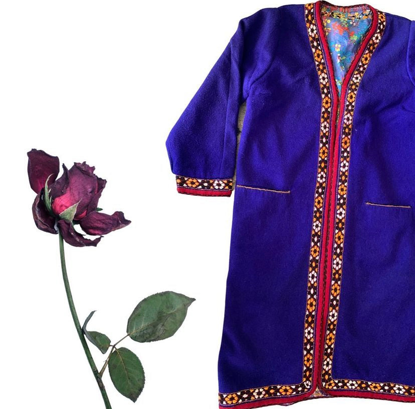 This incredible vintage handmade embroidered ethnic coat will transform your boho wardrobe! Replete with dramatic embroidery, the deep blue Turkmen robe hails from the 30s or 40s. Gorgeous lining and contrasting details at sides make this antique piece even more unique.
